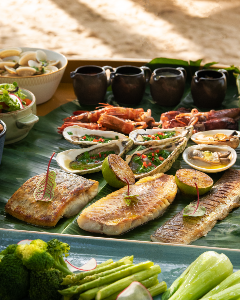 在海边品尝丰盛的海鲜自助餐盛宴——这里汇聚了本地美食精华与新鲜刺身。